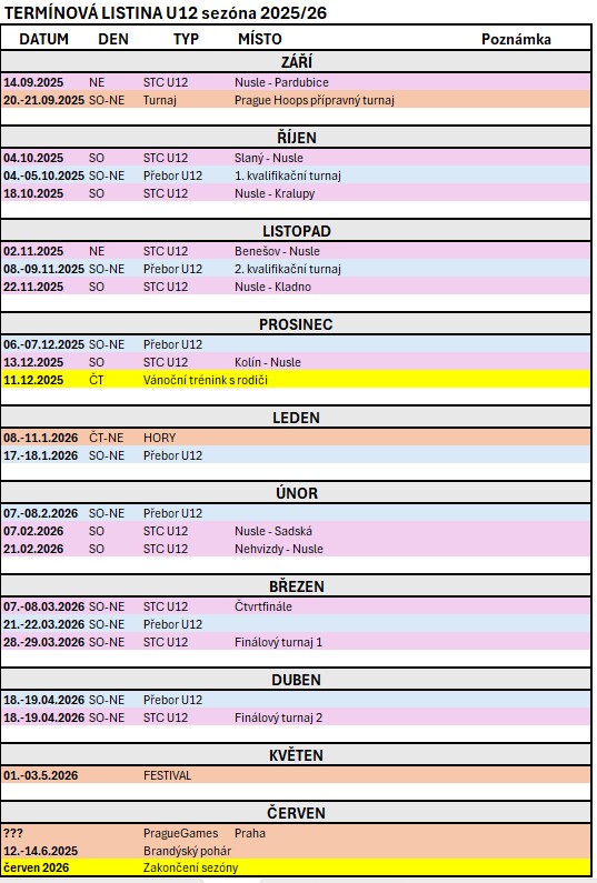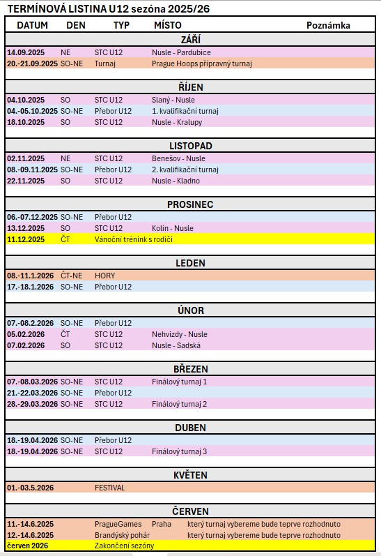 Do sezóny 2025/26 nastoupí do kategorie U12 holky ročníku 2014, které budou doplněny mladšími ročníky 2015 z U11 týmu. V sezóně 2025/26 bude hrát tým soutěž Pražský přebor a doplňující soutěž Střední Čechy U12. Rok bude obohacen několika turnaji.